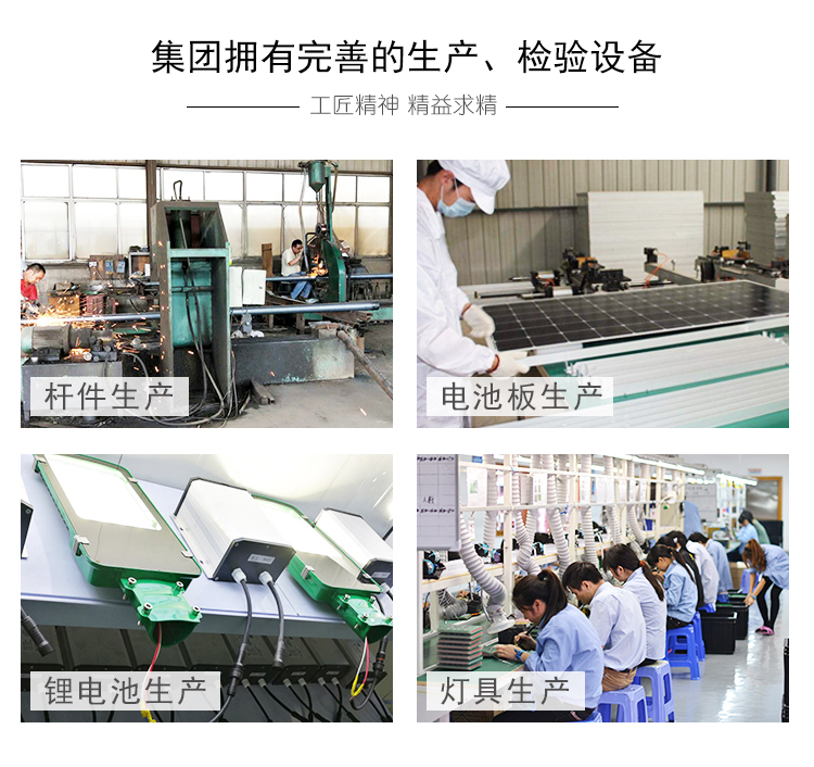 公司擁有路燈加工和檢測(cè)儀設(shè)備,有豐富經(jīng)驗(yàn)的太陽(yáng)能路燈產(chǎn)品研發(fā)人員和產(chǎn)品技術(shù)人員以及完善的售后保障體系,公司擁有國(guó)家城市道路照明承包資質(zhì)?,F(xiàn)有工廠兩座,工廠現(xiàn)有員工200余人,市場(chǎng)開(kāi)發(fā)人員20余人,工廠占地面積20000m2,擁有生產(chǎn)設(shè)備60多余套,其中1200T大型折彎?rùn)C(jī)能加工一次成型15米鋼桿,另有數(shù)控壓鑄機(jī);高速縱剪機(jī);自動(dòng)收口埋弧焊機(jī);埋弧焊氣焊;焊接探傷設(shè)備;等離子切割機(jī);合縫機(jī);校直機(jī);噴塑生產(chǎn)線;納米噴涂生產(chǎn)線;大型烘箱;不銹鋼生產(chǎn)設(shè)備;沖床;車(chē)床;刨床;鉆、彎等設(shè)備。